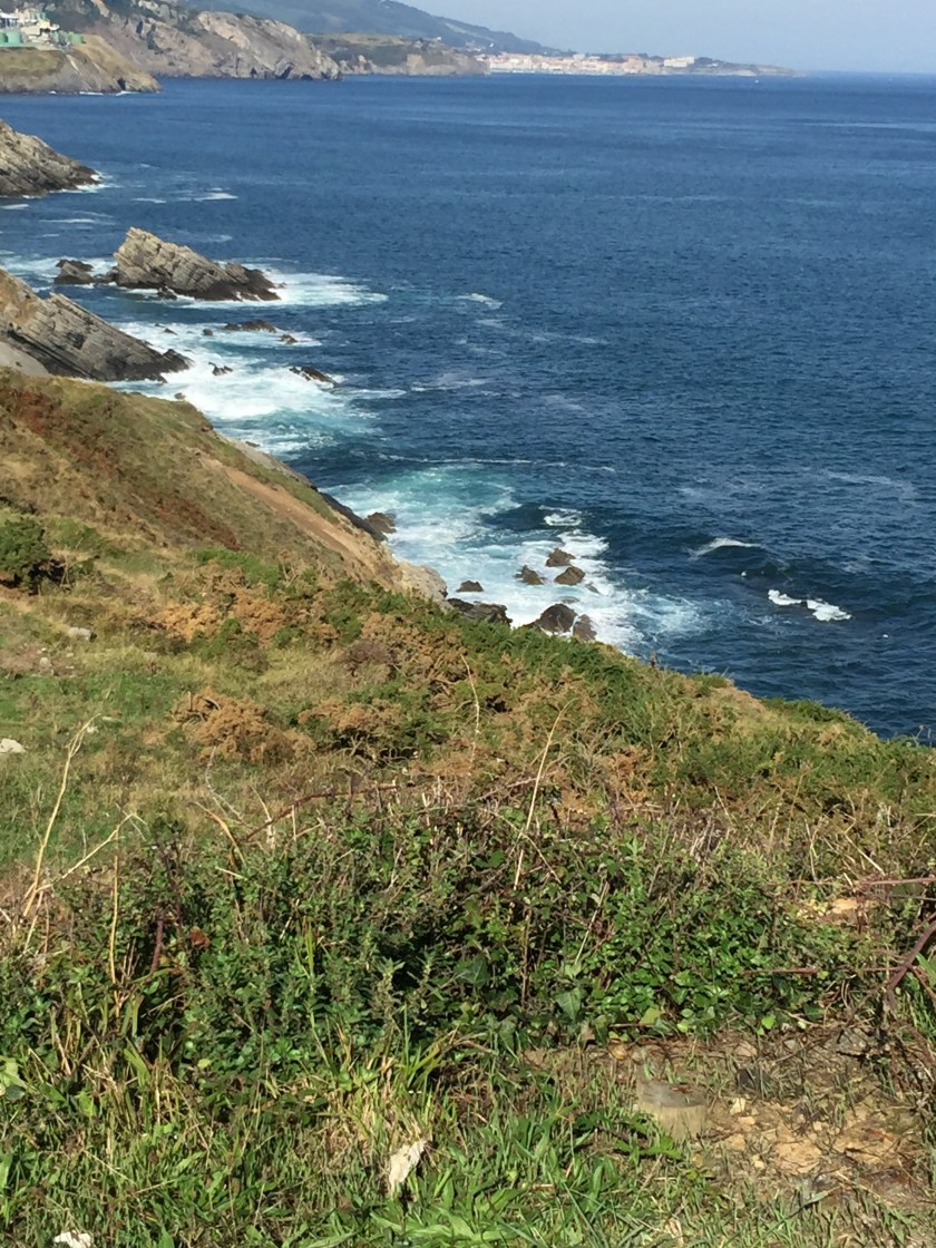 Today our walk took us out of the Basque region into the Cantabria province after climbing about 70 steps up to the top of a cliff we had a very nice walk along a rails-to-trails path that had been paved and was well attended. Beautiful vistas and from the start we could see our afternoons destination jutting out to the sea off in the distance. Later, the Camino led us along a secondary road over a small mountain, through a small village and then back along the coast.