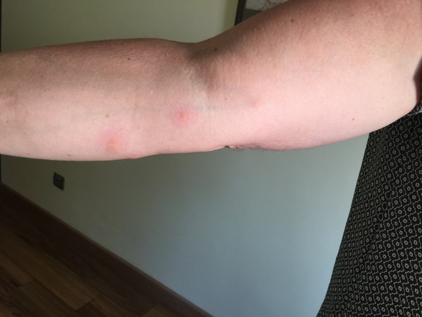 This morning in Villaviciosa, Denise discovered that the few bumps she had developed the day before were not from her walk in the woods as she had assumed but instead a reaction to bedbugs . . . 🙀 We are not certain where she met up with them but she did know she had to be certain there weren’t any living among her clothes. So bedbugs, blisters, and a grumpy knee necessitated a bus ride rather than a walk to Gijon to address all three issues. Once we arrived in Gijon, Denise went straight to a laundery center and washed everything she had in her possession. We then walked to the beach so she could soak in the soothing saltwater. That, along with hot showers, feet soaking, a bottle of Albariño and some local blue cheese had us all feeling much better.